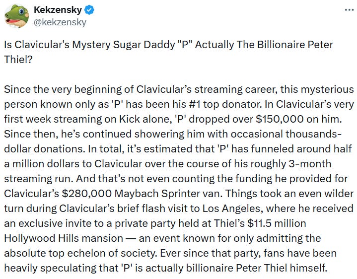 Perhaps, it is not surprising at all then, that Epstein co-conspirator Peter Thiel had personally invited Clavicula to a party at his $11.5 million Hollywood Hills mansion, which Clavicula referred to as a “Diddy party.” The exchange in which this information was revealed was recorded on stream and is open public knowledge. It probably also wouldn’t be a stretch to say that the mysterious Clavicula donor known as “P,” who funneled over $500,000 to him since the very beginning of his streaming career, is also Peter Thiel himself.
