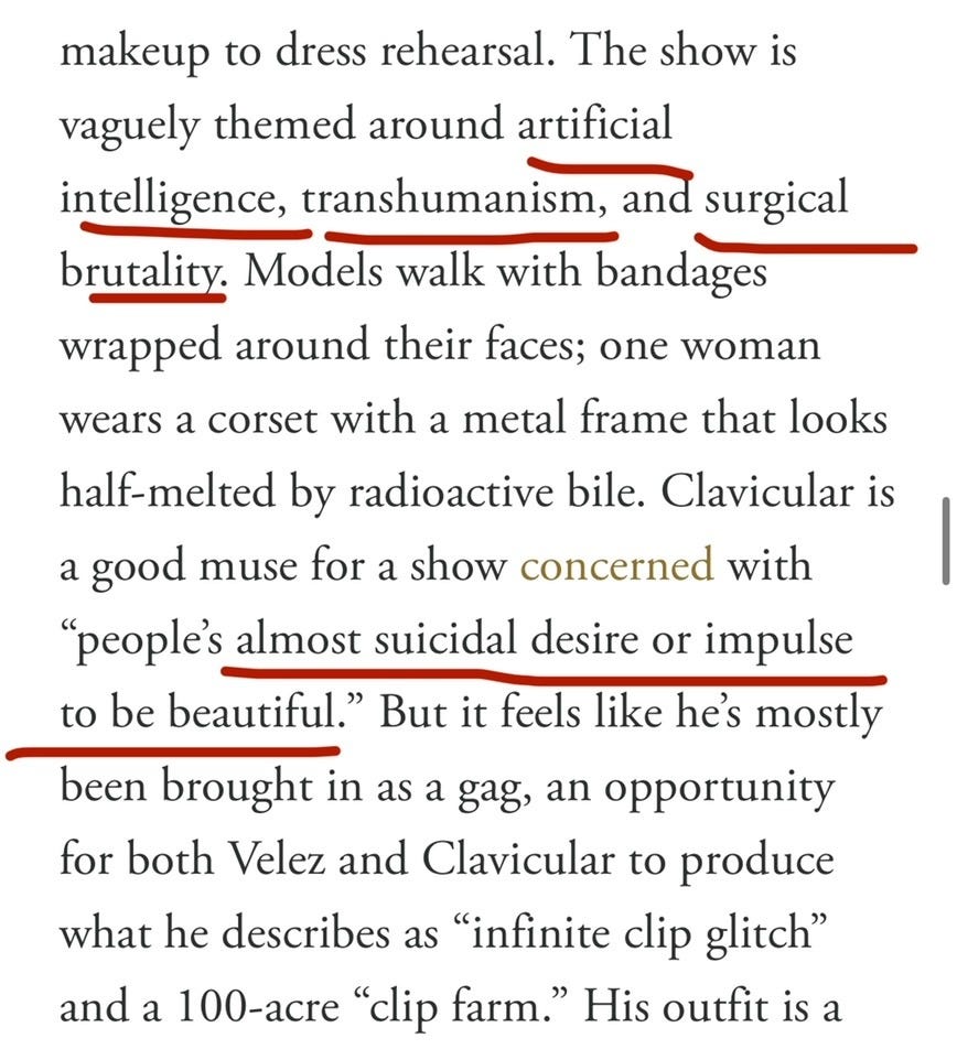 On Feb 12th, 2026, Clavicula walked the runway for designer Elena Velez’s F/W 2026-27 New York Fashions Week show. Here is a profile published by GQ regarding the context of the show and Clavicula’s role in selling the concept: