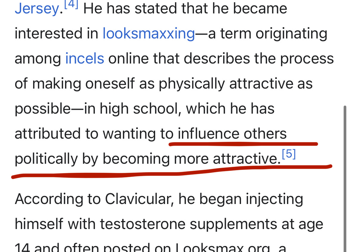 According to his Wikipedia profile, Clavicula’s content focuses on instructing fans on “how to ‘ascend,’ or to become more attractive and ostensibly gain social power and sexual prospects as a result, and to ‘hardmaxx’, a looksmaxxing term for undergoing intense and painful physical alterations.” Note the use of the word “ascension,” or progression from human being towards something greater than, playing on the ages-long idea of emulating the divine. Or, in this case, to emulate the false god, the Antichrist. He also attributes his desire to “ascend” as part of “wanting to influence others politically by becoming more attractive.”